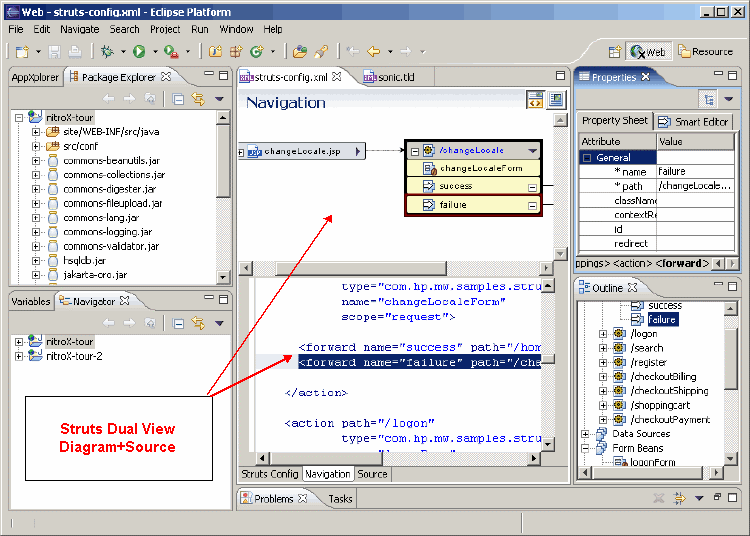 For example Studio gives diagram, tree and source views of the important struts-config.xml controller file.As well the Struts palette works with JSP files simplifying adding forms components there developers can also make custom Struts templates for use both at start up and in JSP includes. Finally, Studio and Pro both maintain synchronization between graphical views and source editing of associated XML and JSP files in all graphical editing. this means changes to primary files through graphical editing always runs true.